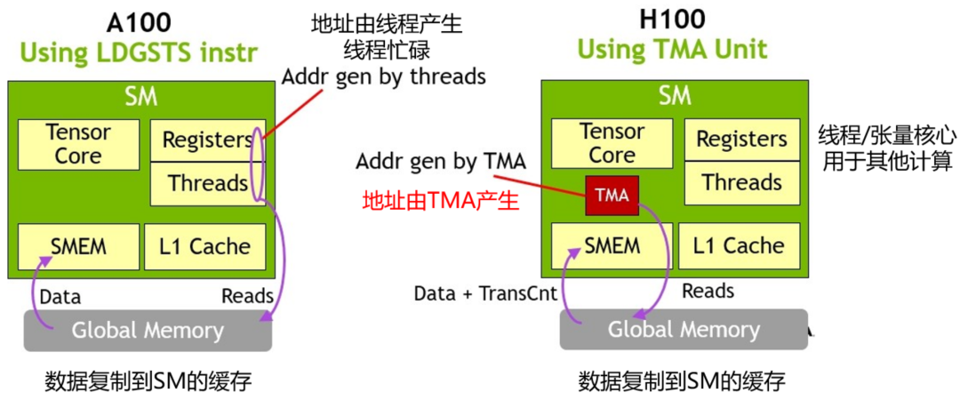 Hopper架构中新增加了 张量存储加速器 (Tensor Memory Accelerator,TMA) ,以提高张量核心与全局存储和共享存储的数据交换效率。