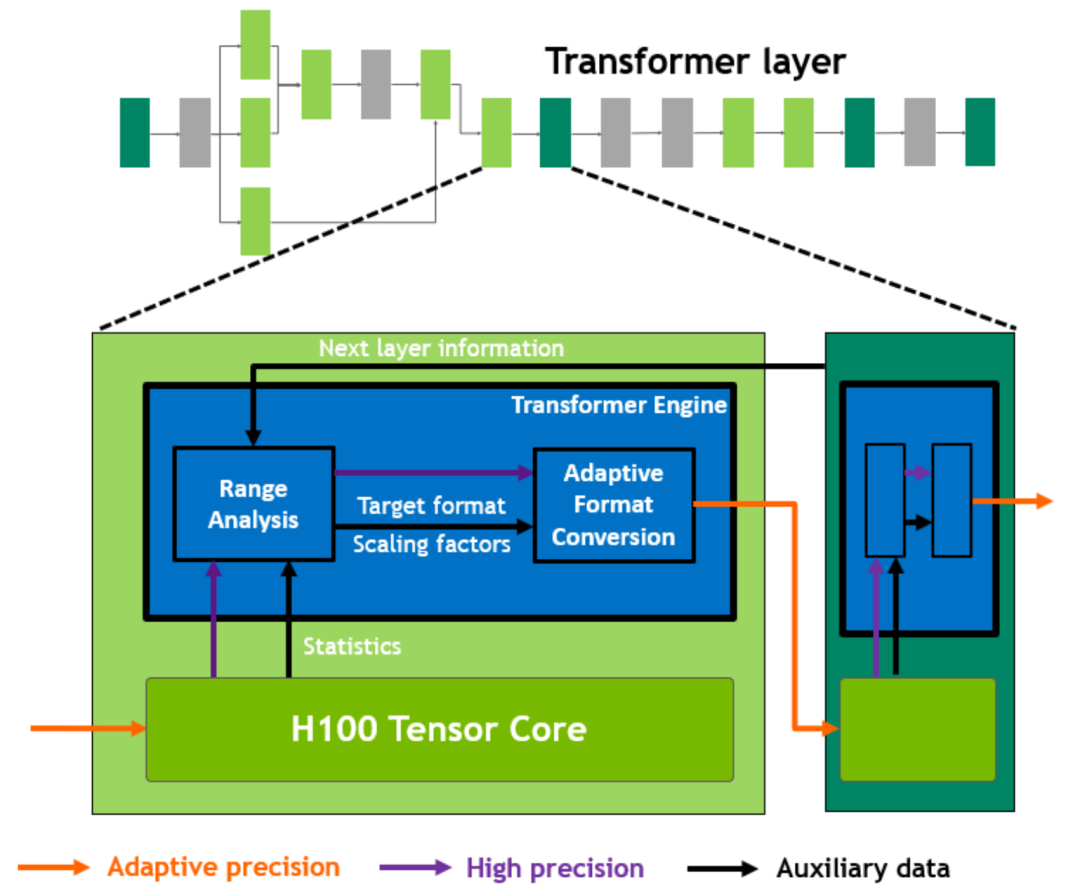 为了提升Transformer的计算效率,在这一新的Transformer引擎中使用了 混合精度 ,在计算过程中智能地管理计算精度,在Transformer计算的每一层,根据下一层神经网络层及所需的精度,在FP8和其他浮点格式中进行动态格式转换,充分运用张量核心的算力。