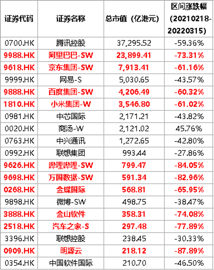 阿里巴巴美股跌72%、港股跌73%;腾讯港股跌超59%;京东美股跌58%、港股跌61%;百度美股跌67%、港股跌60%;拼多多美股跌87%;小米集团港股跌60%。