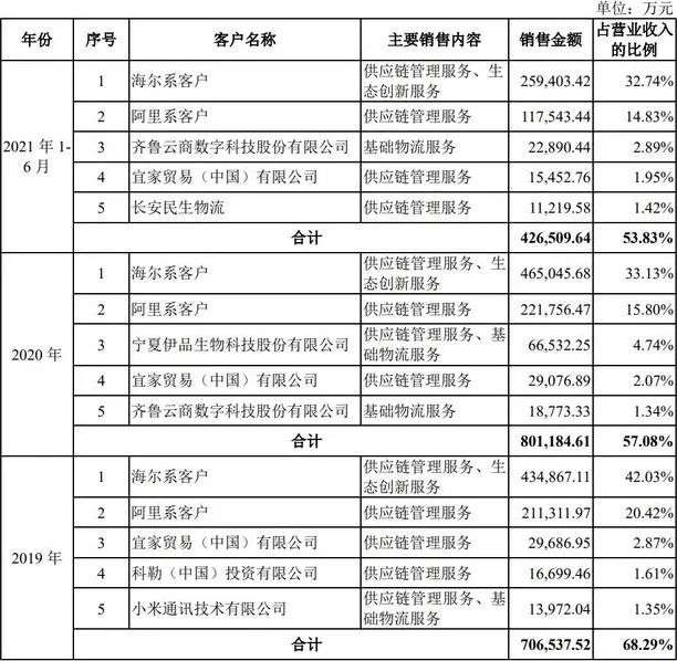 首先是过度依赖海尔、阿里系等关联方。招股书显示,在日日顺的前五大客户中,海尔常年居于首位,占据日日顺营收的30%以上,是日日顺当之无愧的最大客户。