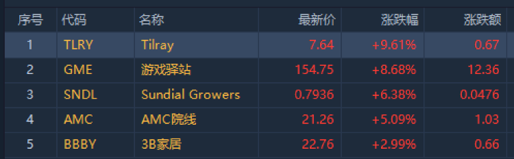 华盛资讯3月25日消息,美股WSB概念股部分上扬,Tilray(TLRY)涨超9%,游戏驿站(GME)涨近9%,Sundial Grower(SNDL)涨超6%,AMC院线(AMC)涨超5%,3B家居(BBBY)涨近3%。