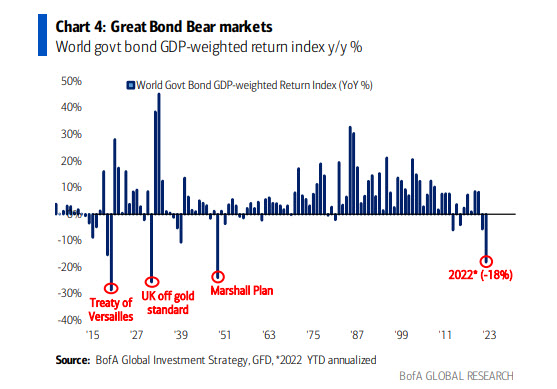 基于同样的原因,美银预计,随着各国央行启动货币紧缩周期,并陆续加息以抑制不断飙升的通胀,政府债券将迎来自1949年以来最糟糕的一年。美银认为,市场上的那些负收益债券将“悄然消失”。