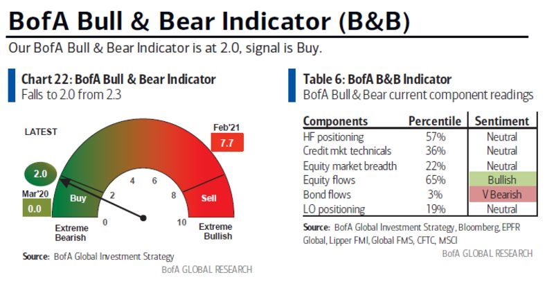 值得一提的是,Hartnett在最新发布的简报中还透露,该行编制的股市“牛熊指标”自2020年3月疫情爆发以来首次亮起了“绿灯”——跌至“买入”区间,这预示着未来几周全球股市或将出现上涨。