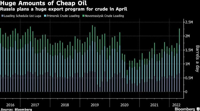 俄罗斯国有石油管道公司Transneft近期公布的计划显示,其计划在4月份从三个西部港口每天向油轮装载226万桶原油,这将是2019年6月以来的最高水平,与本月相比也将有大幅增加。