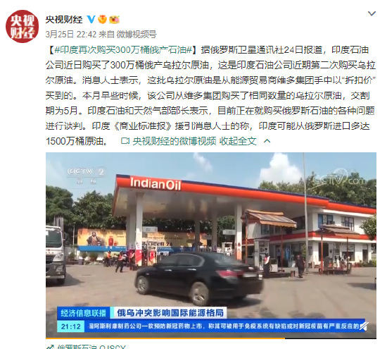【#印度再次购买300万桶俄产石油#】据俄罗斯卫星通讯社24日报道,印度石油公司近日购买了300万桶俄产乌拉尔原油,这是印度石油公司近期第二次购买乌拉尔原油。消息人士表示,这批乌拉尔原油是从能源贸易商维多集团手中以“折扣价”买到的。本月早些时候,该公司从维多集团购买了相同数量的乌拉尔原油,交割期为5月。印度石油和天然气部部长表示,目前正在就购买俄罗斯石油的各种问题进行谈判。印度《商业标准报》援引消息人士的称,印度可能从俄罗斯进口多达1500万桶原油。