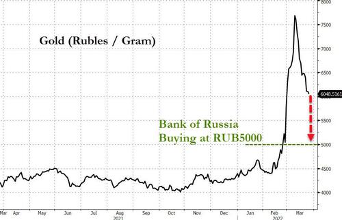 这一价格要明显低于当前以卢布计价黄金的市场价——后者目前价格约为6048卢布/克,相差了整整20%。而这或许意味着,俄罗斯央行认为卢布相对于美元理应进一步走高,其将卢布与黄金捆定的价格,或许也是其心目中为卢布设定的“目标位”。
