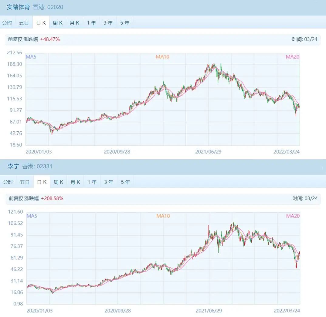 然而如今这两个品牌双双回落,安踏低点跌破80港元,李宁跌破50港元。