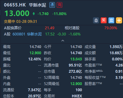 华盛资讯3月28日讯,水泥制造商华新水泥 $06655.HK 今日以“介绍上市”方式正式挂牌港交所,首挂平开,现跌11.80%,报价13.0港元/股,较A股折价逾60%,当前成交额18.7万港元。