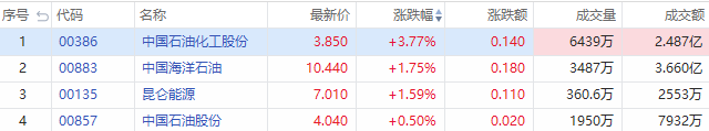 华盛资讯3月28日讯,港股油气股早盘走高,截至发稿,中国石油化工股份涨近4%,中国海洋石油涨近2%,昆仑能源涨超1%,中国石油股份跟涨。