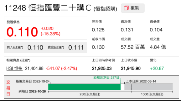 2、看错方向:恒指汇丰二十购C(11248.HK),上周五下跌15.38%。