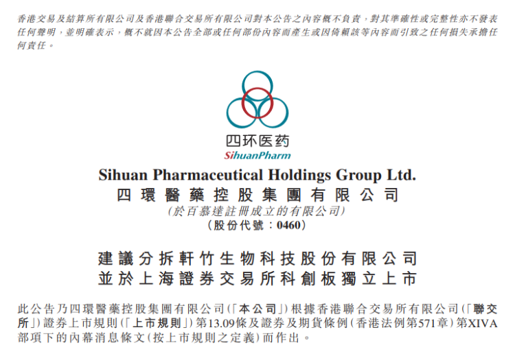 四环医药 $00460.HK 公布,公司董事会一致同意分拆公司附属公司轩竹生物科技股份有限公司(“轩竹生物”)的股份并于上海证券交易所科创板上市。目前,公司直接持有轩竹生物全部已发行股本的约62.39%。由于拟议分拆,公司在轩竹生物中的权益将减少,但是,在分拆上市完成后,公司仍将继续为轩竹生物的控股股东。