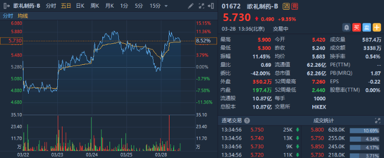 截至发稿,歌礼制药涨9.35%,报5.73港元/股,总市值达到62.26亿港元。