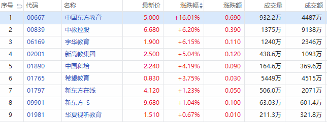 华盛资讯3月28日消息,港股职业教育股午后多数走强,截至发稿,中国东方教育涨超16%领涨板块,中教控股、宇华教育涨超6%,新高教集团涨超5%,中国科培涨超4%,希望教育涨超3%,新东方在线、新东方-S涨超1%。