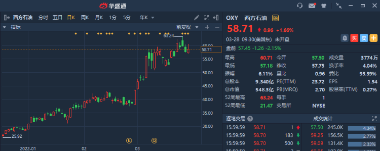 西方石油 $OXY 的股价今年已经翻倍至58.71美元,即便在这样的涨幅下,按照该公司2022年的预计收益计算,其自由现金流收益率仍接近20%。