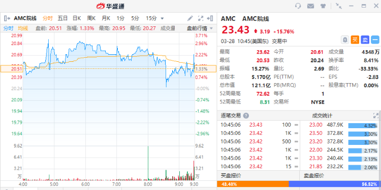 华盛资讯3月28日消息,美股WSB概念股部分上扬,AMC院线(AMC)涨近16%,成交额为9.3亿美元;游戏驿站(GME)涨超8%,高斯电子(KOSS)涨超3%,3B家居(BBBY)涨超1%。