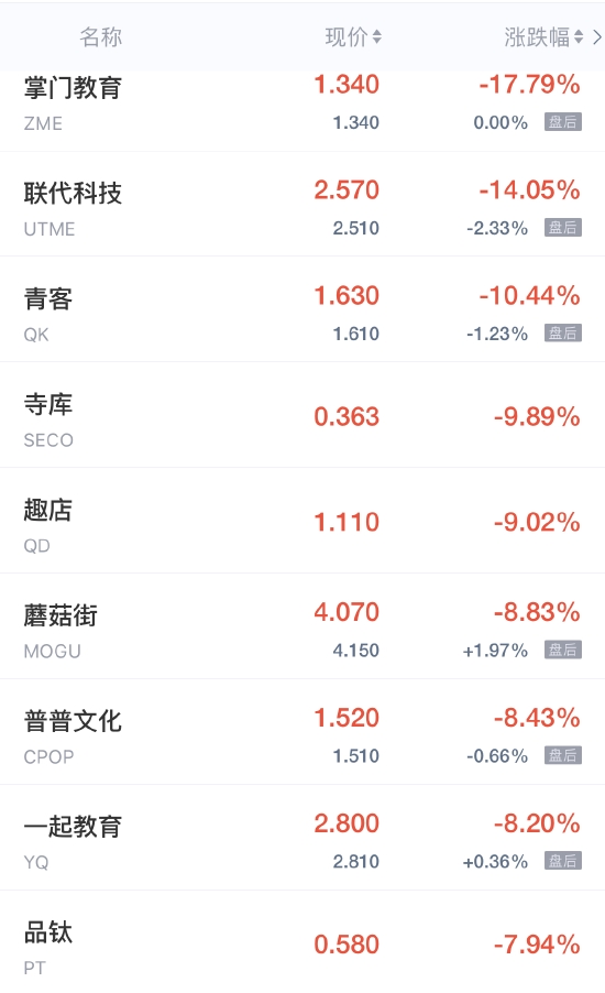 掌门教育跌超17%,寺库跌近10%,趣店跌超9%,蘑菇街跌近9%,一起教育、普普文化跌超8%,红黄蓝、流利说跌超6%,瑞幸粉单跌近4%,每日优鲜、房天下、凤凰新媒体跌超3%,水滴公司、BOSS直聘、高途跌超2%,拼多多、云米科技、迅雷、欢聚集团跌超1%。