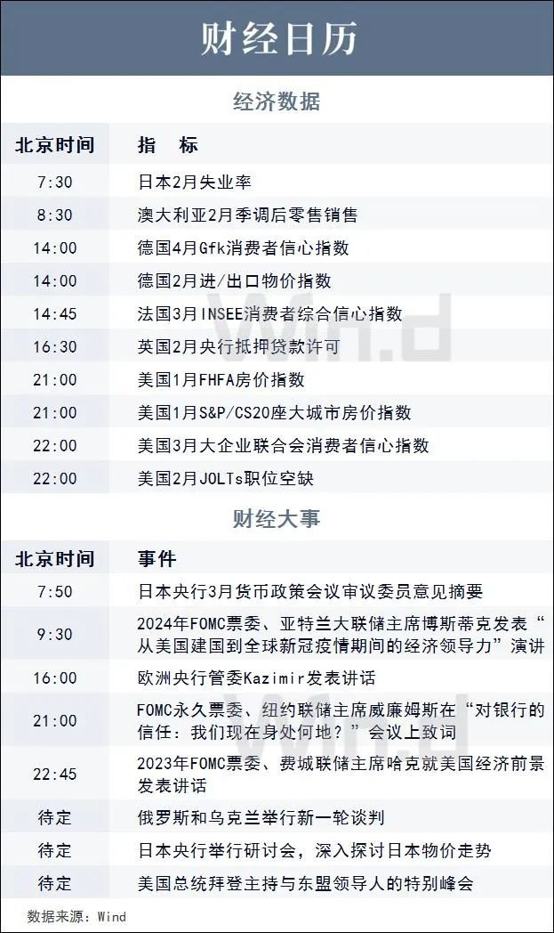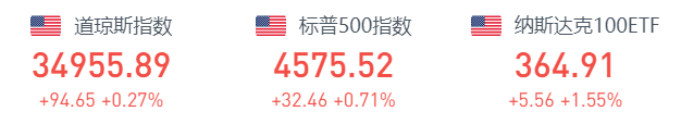 截至3月28日周一收盘,道指涨94.65点,涨幅为0.27%,报34955.89点;纳指涨185.60点,涨幅为1.31%,报14354.90点;标普500指数涨32.46点,涨幅为0.71%,报4575.52点。