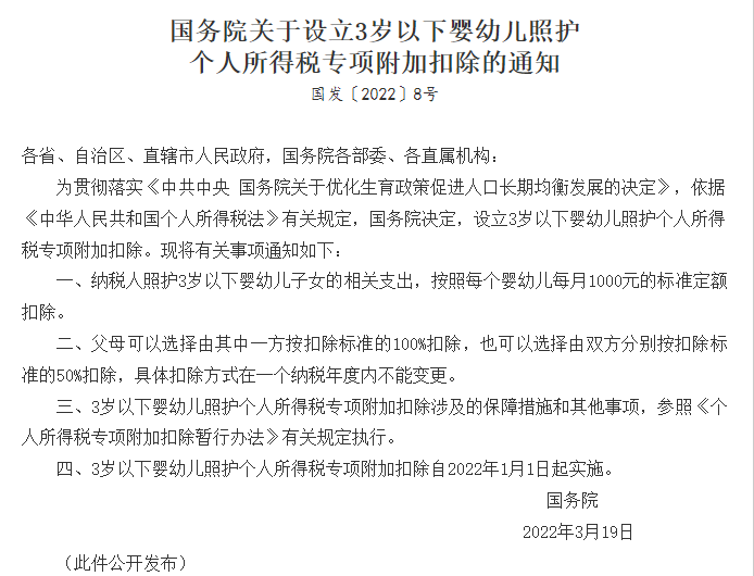3月28日,国务院发布了《关于设立3岁以下婴幼儿照护个人所得税专项附加扣除的通知》。国务院表示,纳税人照护3岁以下婴幼儿子女的相关支出,按照每个婴幼儿每月1000元的标准定额扣除。父母可以选择由其中一方按扣除标准的100%扣除,也可以选择由双方分别按扣除标准的50%扣除,具体扣除方式在一个纳税年度内不能变更。作为优化生育政策的配套支持措施之一,体现了国家对人民群众生育养育的鼓励和照顾,有利于减轻人民群众抚养子女负担。该项政策实施后,有3岁以下婴幼儿的家庭都将从中受益。