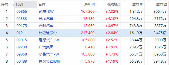 华盛资讯3月29日讯,港股汽车股早盘集体走高,截至发稿,蔚来涨超7%,长城汽车涨超4%,吉利汽车涨逾3%,比亚迪股份、理想汽车涨超2%,小鹏汽车、广汽集团、东风集团股份涨超1%。