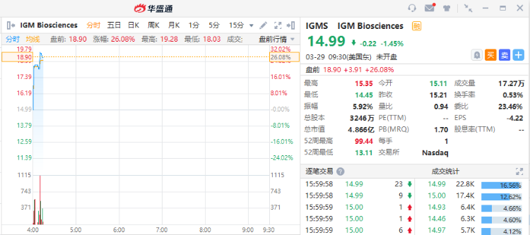 华盛资讯3月29日消息,美股盘前,IGM Biosciences(IGMS)盘前涨超26%,公司将与赛诺菲(SNY)在肿瘤、免疫、炎症治疗领域展开合作。