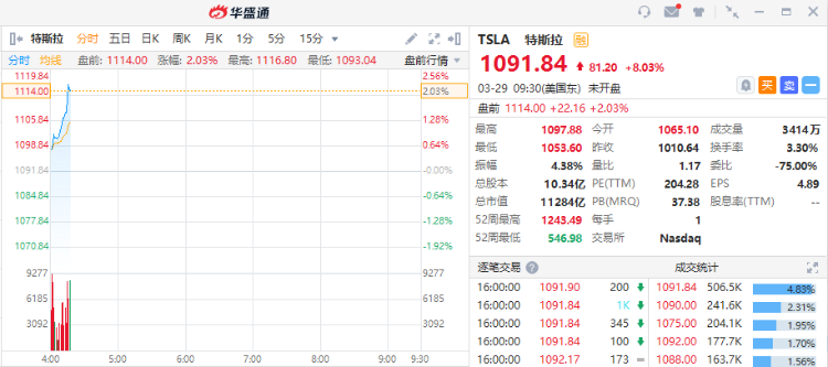 特斯拉续涨超2%,股价报1114.00美元,周一大幅收涨8%。韦德布什分析师Daniel Ives指出,此次拆股将成为特斯拉股价持续上行的催化剂。