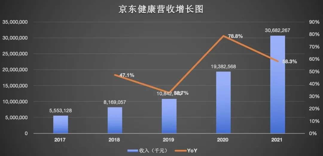 2021年,京东健康除了毛利率下滑2%外,其营收保持增长,亏损收窄,年度活跃用户数、商品SKU、仓库、医疗资源规模等均有突破,可以说2021年是京东健康向上的一年。