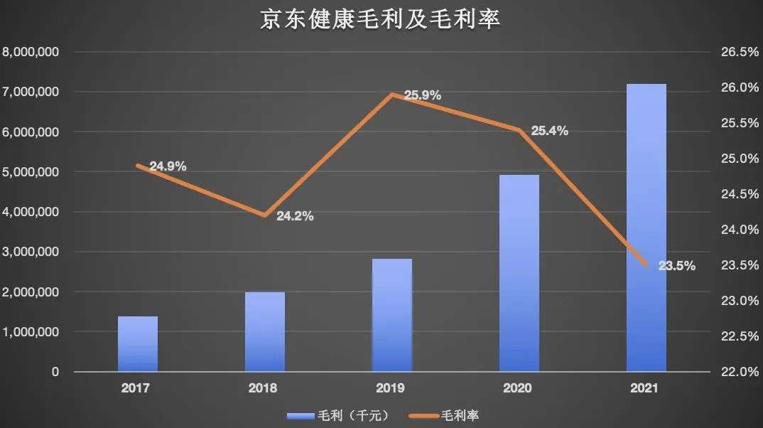 数据显示,京东健康2017年、2018年、2019年、2020年和2021年的毛利分别为14亿元、20亿元、28亿元、49亿元和72亿元,对应的毛利率分别为24.9%、24.2%、25.9%、25.4%和23.5%,2021年京东健康毛利率较2020年下下滑近2个百分点。