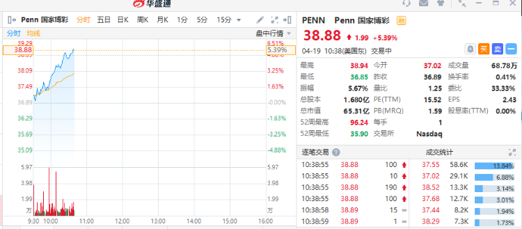 华盛资讯4月19日消息,美股盘初,美股博彩股普遍走高,Penn国家博彩(PENN)涨超5%,永利度假村(WYNN)涨超5%,Draftkings(DKNG)涨超5%。