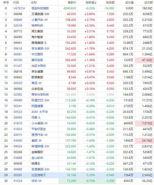 快手跌超6%,比亚迪电子跌超5%,百度跌超2%,哔哩哔哩跌超1%,美团跌1%。