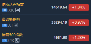周二,三大股指都取得了靓丽表现,截至收盘,道指收盘上涨599.10点,涨幅为1.82%,报33544.34点;纳指涨367.40点,涨幅为2.92%,报12948.62点;标普500指数涨89.34点,涨幅为2.14%,报4262.45点。上涨的主要因素是投资者对俄罗斯和乌克兰之间的停火谈判变得更加乐观。