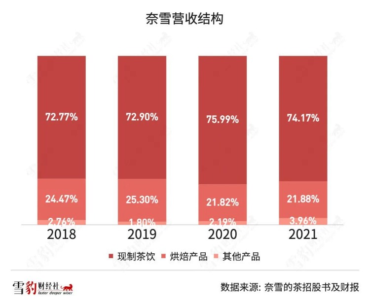 分板块来看,现制茶饮依然是奈雪营收的主要构成部分,2021年营收31.87亿元,在总营收中占比74.2%,烘焙产品营收9.4亿元,在总营收中占比21.9%。