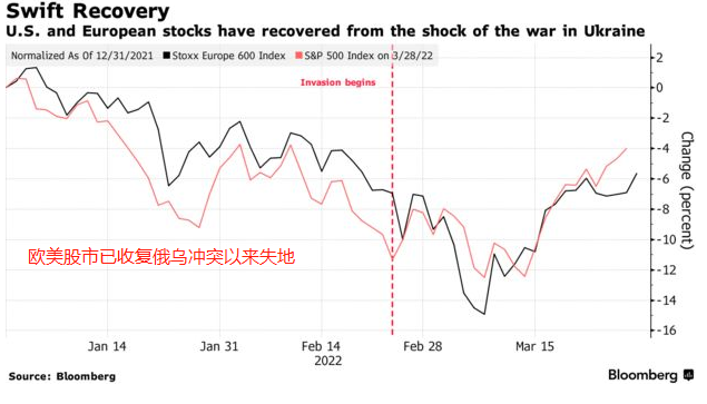 即便俄乌局势还未出现明显转机,这两周以来的欧美股市都保持了良好的上涨势头。此前物价飙升和美债收益曲线趋平给人们带来了对经济衰退的担忧,目前来看主要影响的是债券市场,股市则已经收复了俄乌冲突以来的失地。