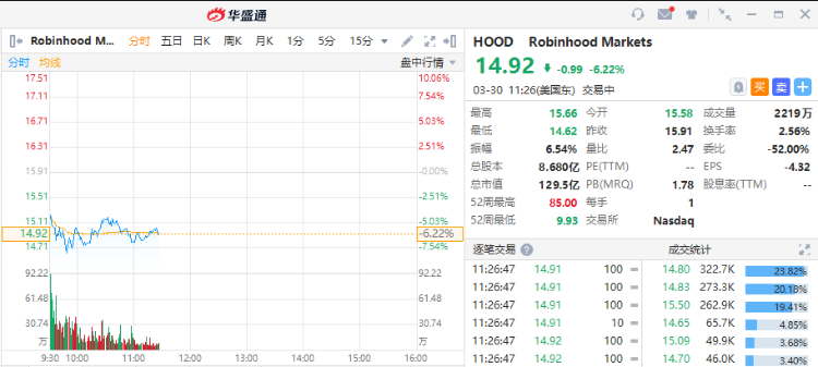 华盛资讯3月30日消息,美股早盘,美股WSB概念股多数走低,Robinhood(HOOD)跌超6%,维视图像(MVIS)跌超5%,AMC院线(AMC)跌超5%,SOS(SOS)跌近5%,游戏驿站(GME)跌超2%,Roblox(RBLX)跌超1%;大麻股Tilray(TLRY)涨超6%。