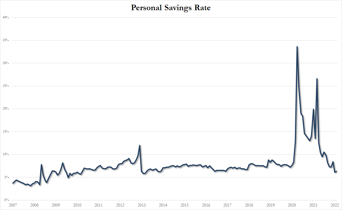 另外,美国2月个人支出月率仅录得0.2%,远低于预期的0.5%,表明40年来最快的价格上涨速度正在抑制需求。金融博客零对冲指出,经通胀调整后的个人支出正在萎缩,需求破坏可能开始显现,这也导致个人储蓄率徘徊在2013年以来的最低水平。