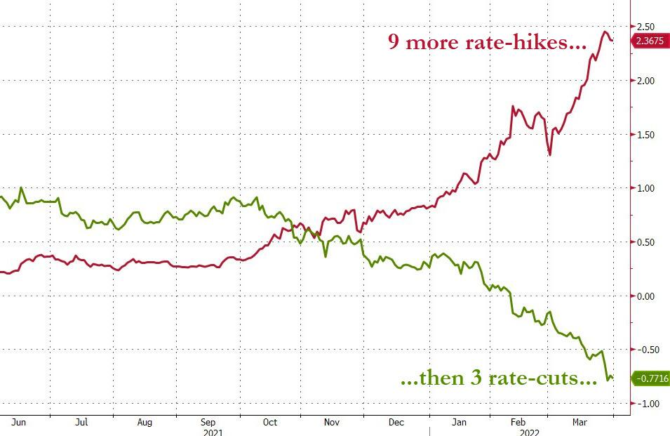 交易员预计,美联储将在今年年底前加息200多个基点,这意味着至少有两次会议需要加息50个基点。债券市场的定价似乎也同意这一点,目前部分收益率曲线要么短暂倒挂,要么接近倒挂,预示着出现经济衰退的可能。