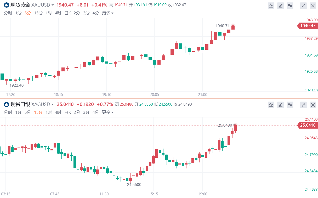 现货黄金持续上行,站上1940美元/盎司;白银站上25美元关口。