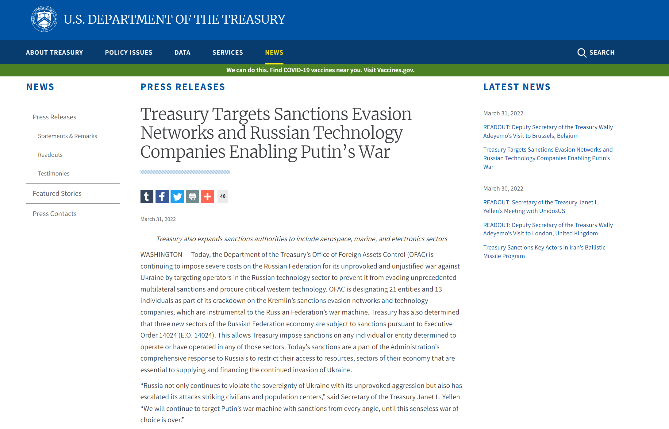 “我们将继续从各个角度对俄罗斯进行制裁,直到这场毫无意义的冲突结束,”财政部长耶伦(Janet Yellen)在声明中指出。