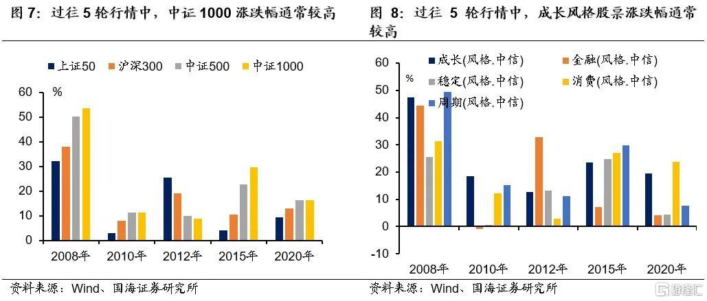 进一步地研究历史上5轮“销售底”出现后1个季度、大盘全面上涨的行情中,各个细分板块表现,我们发现:从市值的角度,有弹性的小盘股表现通常较优;从风格的角度,有进攻性的成长股表现通常较好。