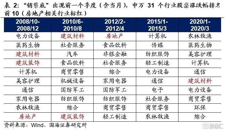 历史上,在“销售底”出现之前,经济基本面总体仍处于衰退末期中,股市缺乏较多的投资机会。在此情况下,受到政策乐观情绪影响的房地产板块,通常表现能够超越大盘(如表2)。而目前“稳地产”政策正在陆续推出,带来房地产板块相应的投资机会,同样值得关注。