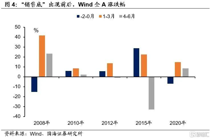 对比过往5轮“销售底”出现前1个季度(含当月),及出现后第1个季度、第2个季度的大盘表现,我们发现“销售底”出现后1个季度,通常是中期内股市大盘表现较好的时候。
