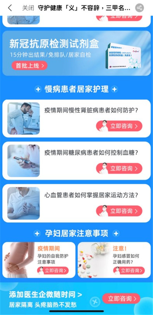 针对重点关注的慢性病患者、老年人、儿童、孕产妇、残疾人等群体,复星健康集结的医生队伍,既覆盖了与疫情高度相关的科室,如呼吸内科、精神心理科、中医科等,也包括了诸如皮肤科、骨科、儿科、消化内科、妇产科等其他科室。“为了便于公众从自身需求入手,我们将页面设置成了家庭常见病、慢性疾病、孕妇等咨询专区。”李胜利指出,重点关注群体足不出户便能在平台上就医问诊与用药咨询,如遇紧急突发情况,平台医生也可帮助快速判断病情,引导民众及时、科学地采取下一步应对措施或到线下医院就诊。