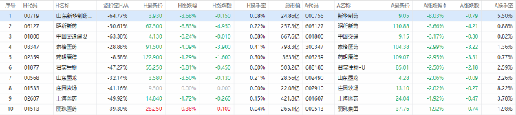 昭衍新药A股跌3.66%,H股跌6.83%,中国交通建设A股跌3.17%,H股跌0.24%,泰格医药A股跌2.99%,H股跌4.09%。