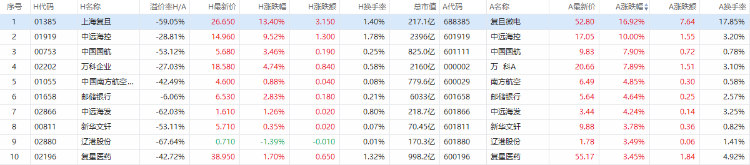 截至发稿,上海复旦A股涨16.92%,H股涨13.4%,中远海控A股涨停,H股涨9.52%,中国国航A股涨7.9%,H股涨3.46%。