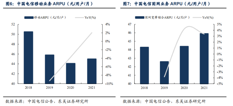 中国移动继续保持领先,2021年ARPU达到48.8元,较2020年显著提升,扭转了下滑趋势。2021年家庭宽带客户净增2588万户,增速领先行业,家庭宽带综合ARPU保持良好增长。