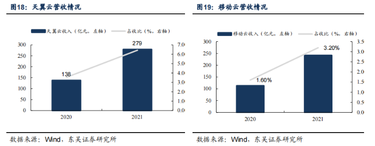 中国电信方面在2021年对外可用IDC机架达47万台,同比增长了11.9%。预计2022年在IDC项目上还将投资65亿元,在云资源项目上投资140亿元,新增投产16万台云服务器。2021年,移动云收入达242亿元,同比增长114%;天翼云收入达279亿元,同比增102%,云业务均保持高速增长。