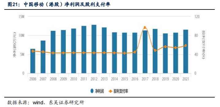 2006-2021年,中国移动已实施现金分红16次,累计分红金额高达约8790亿元,平均分红率49.75%。截至2021年12月31日,中移动每股派息2.43港元,同比增38%,分红率达60%。根据公告披露,2021年起3年内以现金方式分配的利润将逐步提升至当年股东应占利润的70%以上。