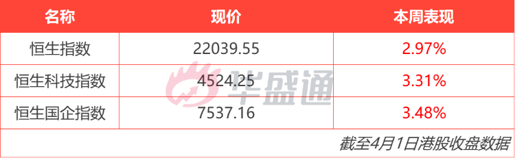 恒生指数本周涨2.97%,报22039.55点;恒生科技指数本周涨3.31%,报4524.25点;国企指数本周涨3.48%,报7537.16点。