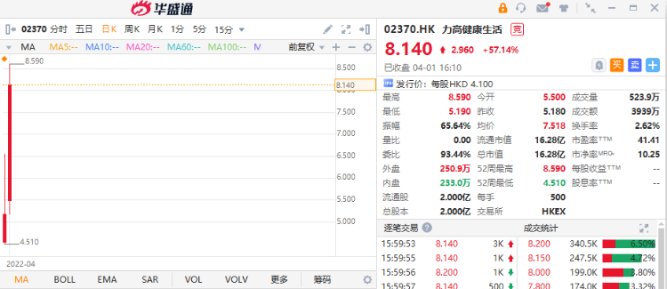 2022年3月31日,力高健康生活有限公司在香港联合交易所主板正式挂牌上市,截至4月1日收盘,该股上涨57.14,报8.14港元每股,两日累计涨幅近100%。