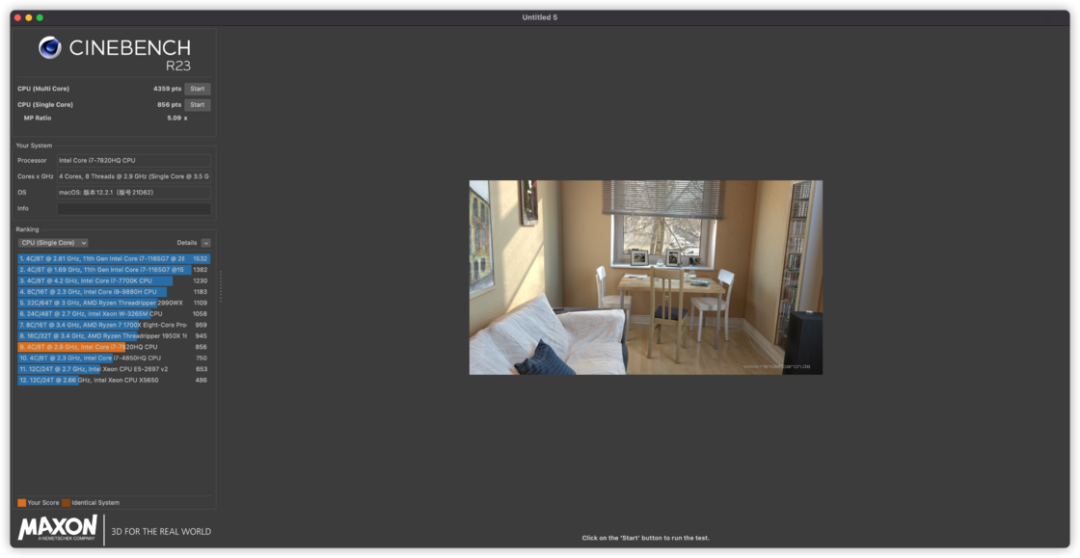 CineBench R23 的测试则是取得了了单核 856pts,多核 4359pts 的成绩,基本符合这款 CPU 的参数和表现。