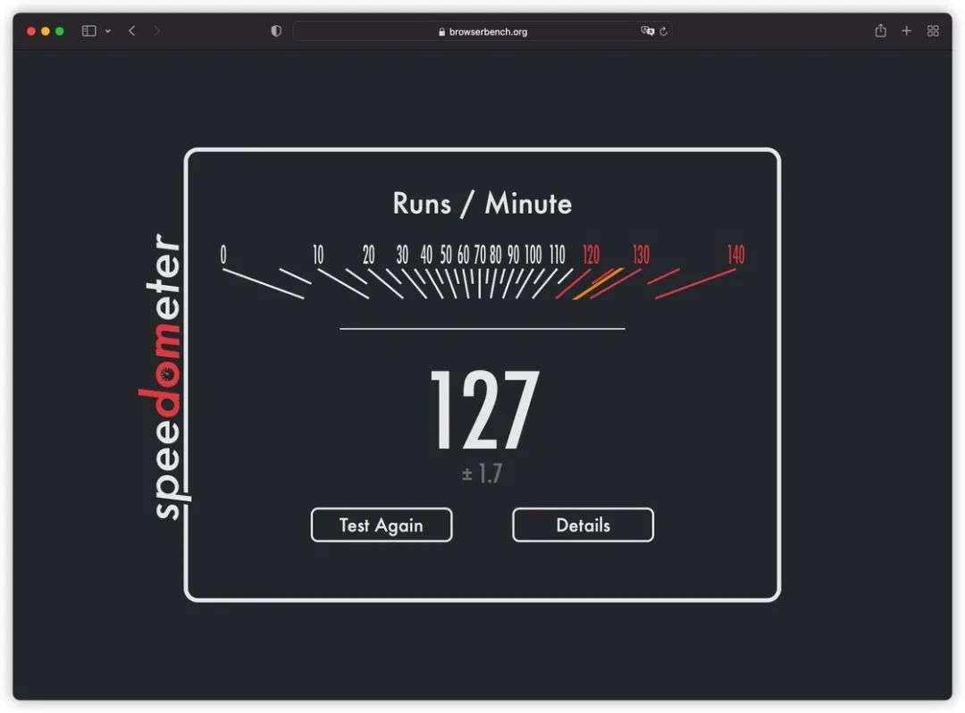Speedometer 是用于浏览器开发者们测试测试浏览器引擎的工具集,这也是苹果对 WebKit 开发社区的一共公益性的项目。 Speedometer 2.0使用一系列网络和浏览器技术,在浏览器中运行多达 480 项测试,通过执行这些测试项目来了解浏览器引擎性能与笔记本的性能。